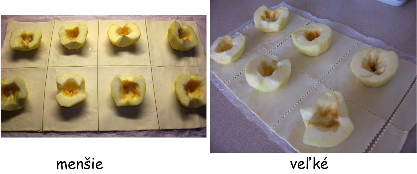Plát lístkového cesta rozdelím na 6, alebo 8 častí, podľa veľkosti jabĺk.