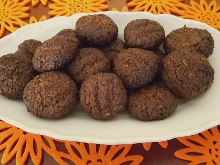 Strúhaný kokos nasucho opečiem na panvičke, cca 2-3 min., len aby sa rozvinula jeho vôňa. Po vychladnutí ho na jemnejšie pomeliem v mlynčeku na kávu. V miske zmiešam kokos, arašidové maslo izbovej teploty, práškový cukor, hladkú múku (používam celozrnnú), vanilkový cukor (používam svoj domáci), kakao, vajce a pridám štipku soli.